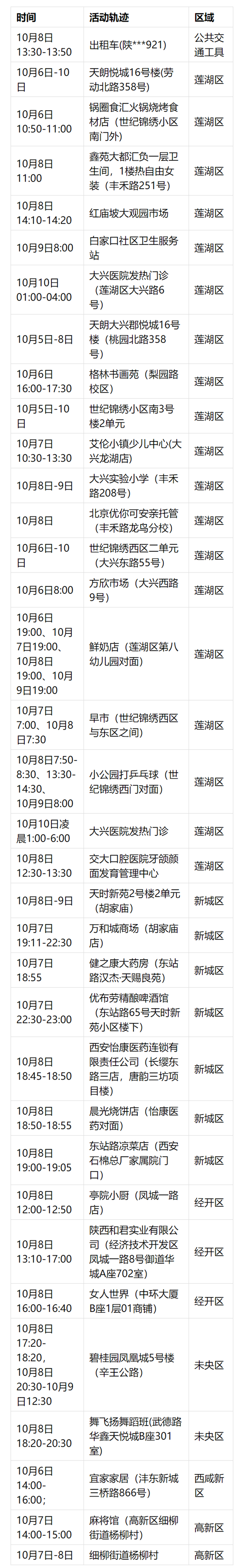 10月10日0-24時(shí),西安市新增11例本土感染者(4例確診病例,7例無(wú)癥狀感染者),其中4例為省外來(lái)陜返陜?nèi)藛T,7例為已診斷病例的密切接觸者;2例主動(dòng)報(bào)備后在卡口即管控,6例在集中隔離中發(fā)現(xiàn),3例在主動(dòng)就醫(yī)時(shí)發(fā)現(xiàn)。經(jīng)初步流調(diào),病例在隔離管控前涉及到的活動(dòng)軌跡為: