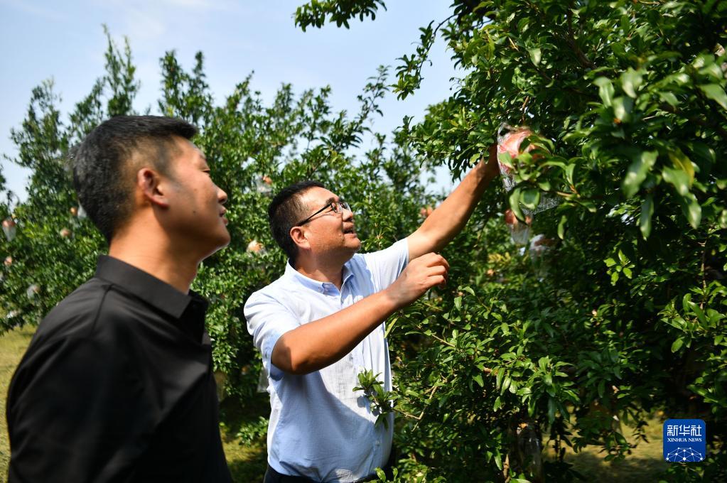 陜西省西安市臨潼區(qū)園藝工作站工作人員(右)與當(dāng)?shù)厥穹N植大戶交流果品長(zhǎng)勢(shì)(2022年9月26日攝)。新華社記者 張博文 攝