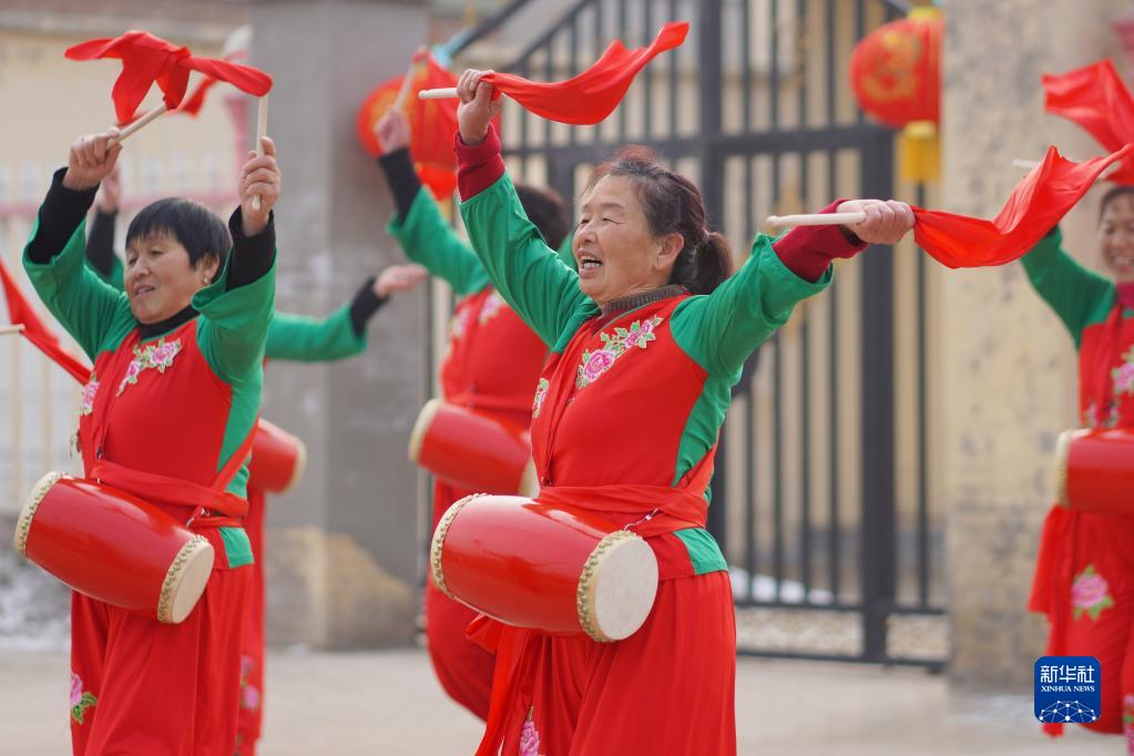 河北省邢臺(tái)市內(nèi)丘縣史村屯村村民在廣場(chǎng)排練腰鼓(2022年1月29日攝)。新華社發(fā)(劉繼東 攝)