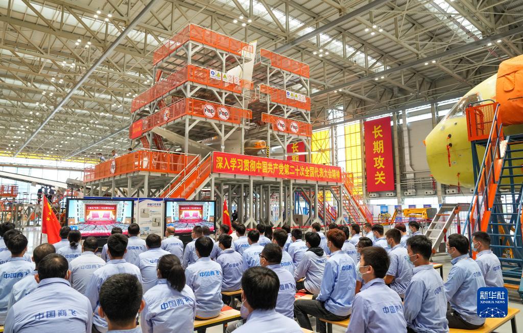 10月16日,在中國商飛上海飛機制造有限公司總裝車間,員工們在收看中國共產(chǎn)黨第二十次全國代表大會開幕會。新華社記者 丁汀 攝