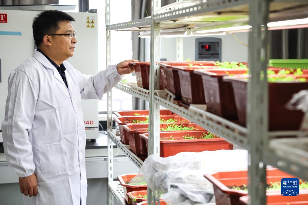 10月20日,貴州大學(xué)動物科學(xué)學(xué)院院長陳超在實(shí)驗(yàn)室內(nèi)觀察新品種牧草的生長情況。新華社記者 歐東衢 攝