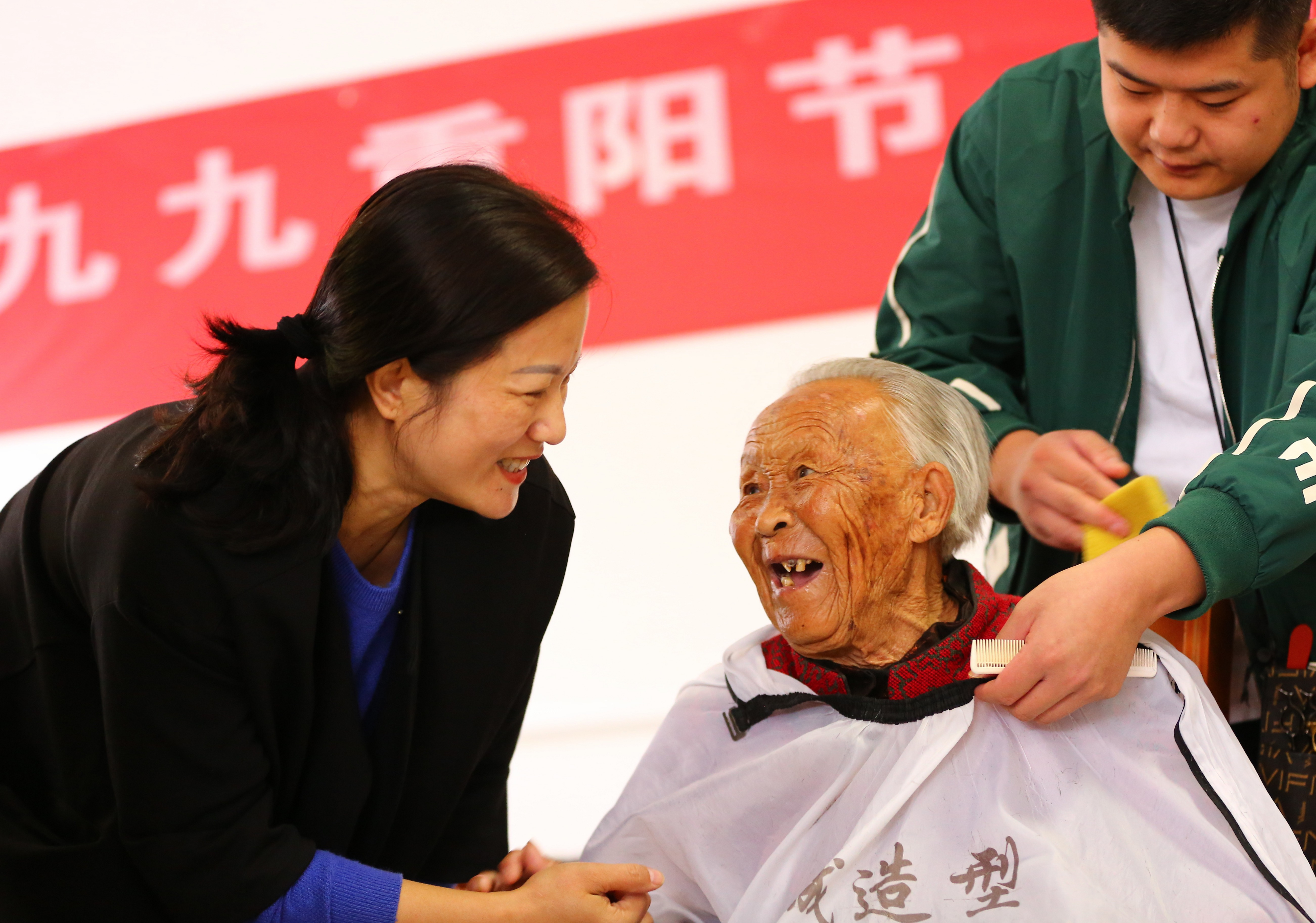 2022年10月4日,在山東省滕州市一家養(yǎng)老院,社會(huì)工作者為老人理發(fā)。新華社發(fā)(李志軍 攝)