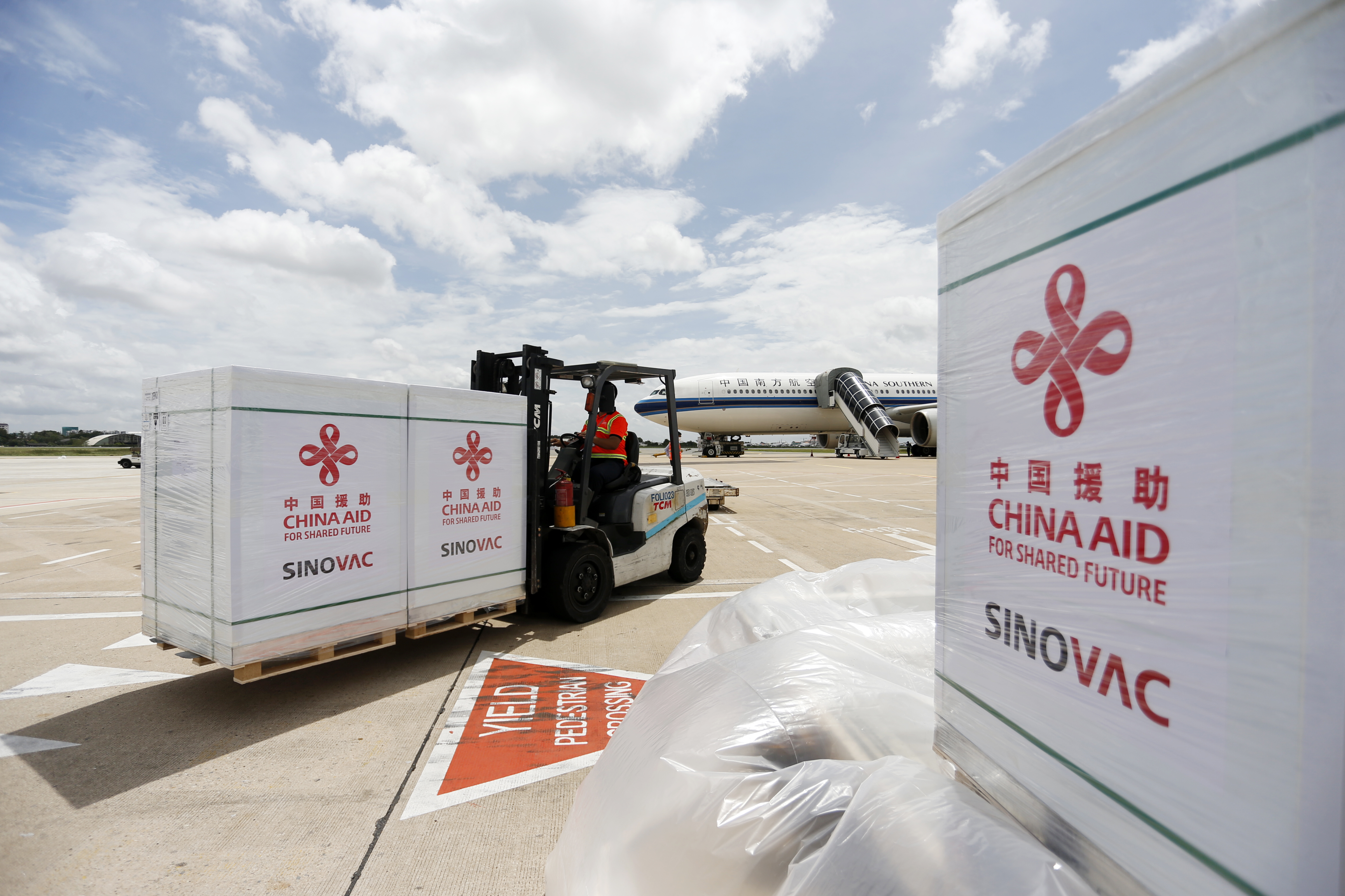工作人員在柬埔寨金邊國(guó)際機(jī)場(chǎng)運(yùn)輸中國(guó)政府援助柬埔寨的科興新冠疫苗(2021年10月14日攝)。新華社發(fā)(批隆 攝)