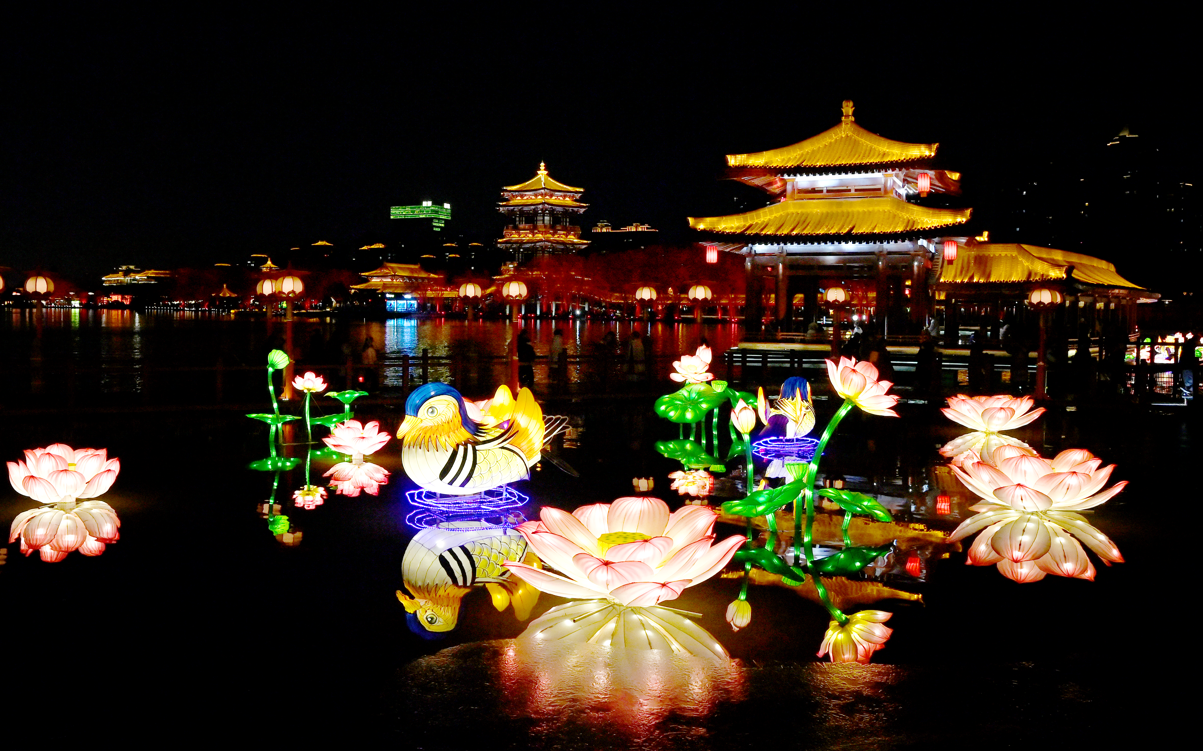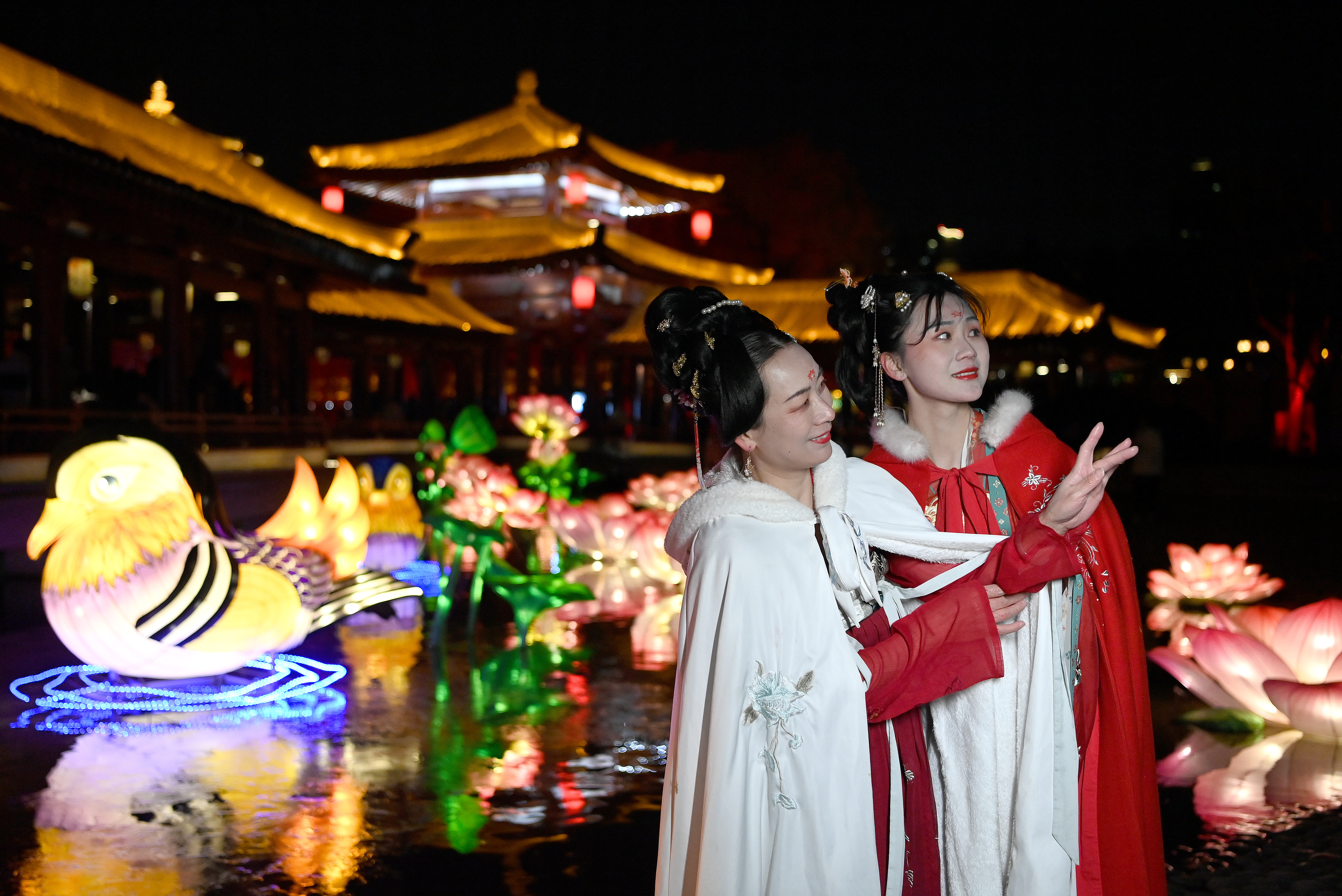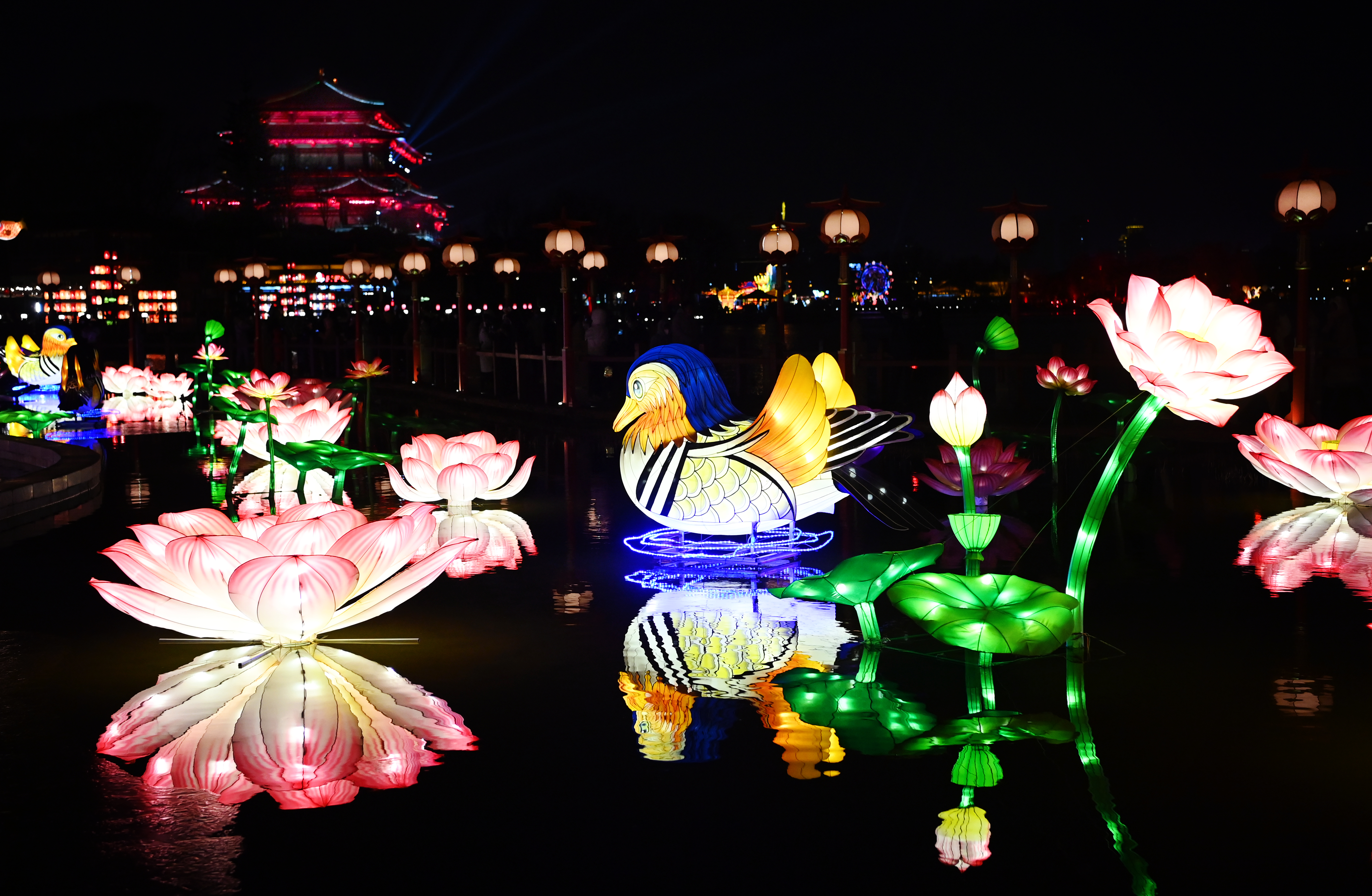 夜幕降臨,西安大唐芙蓉園內(nèi)萬(wàn)盞花燈璀璨綻放,在仿唐式園林的亭臺(tái)樓閣、廊橋水波之間,燈與景交相輝映,美輪美奐。