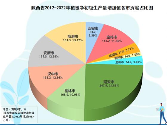 2012-2022年分市元生產(chǎn)量增長貢獻(xiàn)分析結(jié)果表明,各市對全省生態(tài)蛋糕增長均有所貢獻(xiàn),但各市的貢獻(xiàn)大小差異很大,在生態(tài)蛋糕中的地位也隨之有所變化。全國退耕還林策源地美稱的延安是全省生態(tài)蛋糕增量最大的市,10年增加247.9萬噸,為全省生態(tài)蛋糕增加量貢獻(xiàn)了24.9個(gè)百分點(diǎn)。商洛第二,10年增加131.3萬噸,為全省貢獻(xiàn)13.2個(gè)百分點(diǎn)。安康第三,10年增加129.3萬噸,為全省貢獻(xiàn)13.0個(gè)百分點(diǎn)。漢中第四,增加125.2萬噸,為全省貢獻(xiàn)12.6個(gè)百分點(diǎn)。其后,依次分別是寶雞增加113.2萬噸、為全省貢獻(xiàn)11.4%,榆林增加108.9萬噸、為全省貢獻(xiàn)10.9%,西安增加53.7萬噸、為全省貢獻(xiàn)5.4%,咸陽增加37.6萬噸、為全省貢獻(xiàn)3.8%,渭南增加34.4萬噸、為全省貢獻(xiàn)3.4%,銅川增加24.9萬噸、為全省貢獻(xiàn)1.5%。