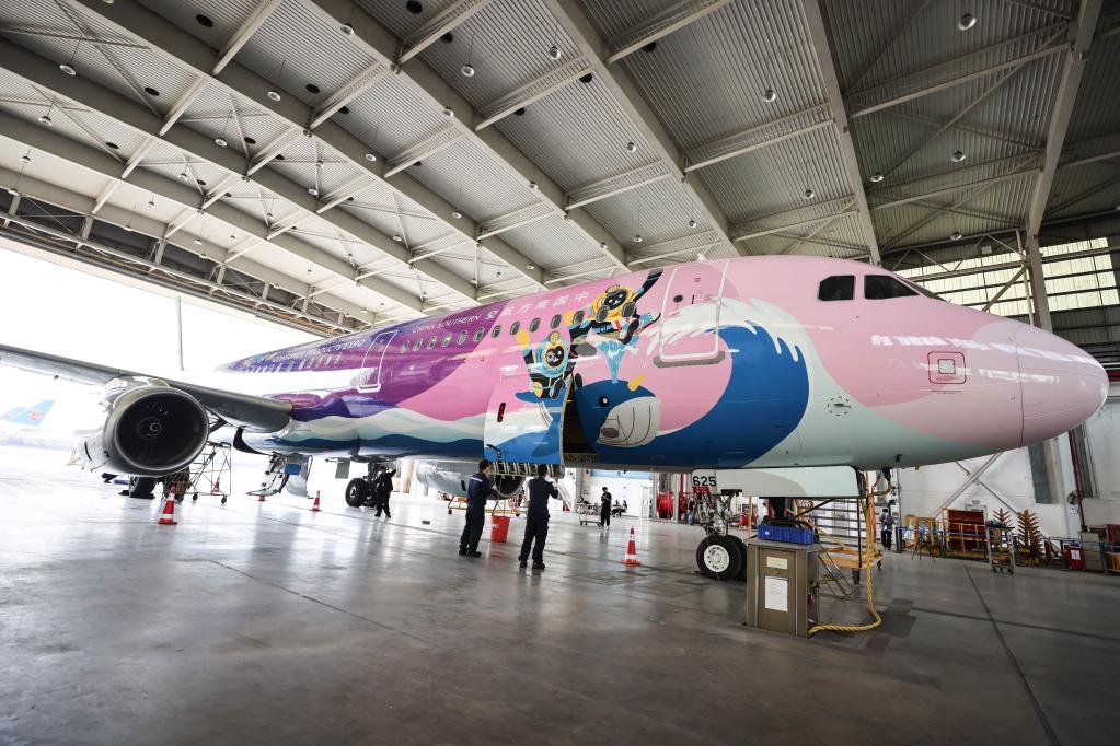 2023年3月7日,在??诿捞m國(guó)際機(jī)場(chǎng),南航機(jī)務(wù)人員對(duì)“消博號(hào)”彩繪飛機(jī)進(jìn)行深度檢查。新華社記者 張麗蕓 攝