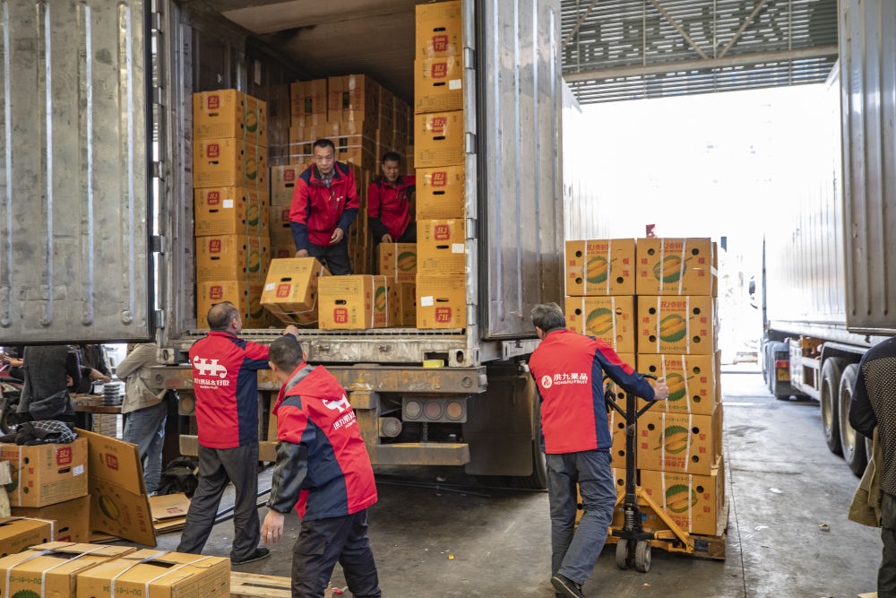 在重慶市江津區(qū)雙福農(nóng)貿(mào)城,洪九果品的工作人員在搬運(yùn)從泰國(guó)運(yùn)輸過(guò)來(lái)的榴蓮(2022年4月19日攝)。新華社記者 黃偉 攝
