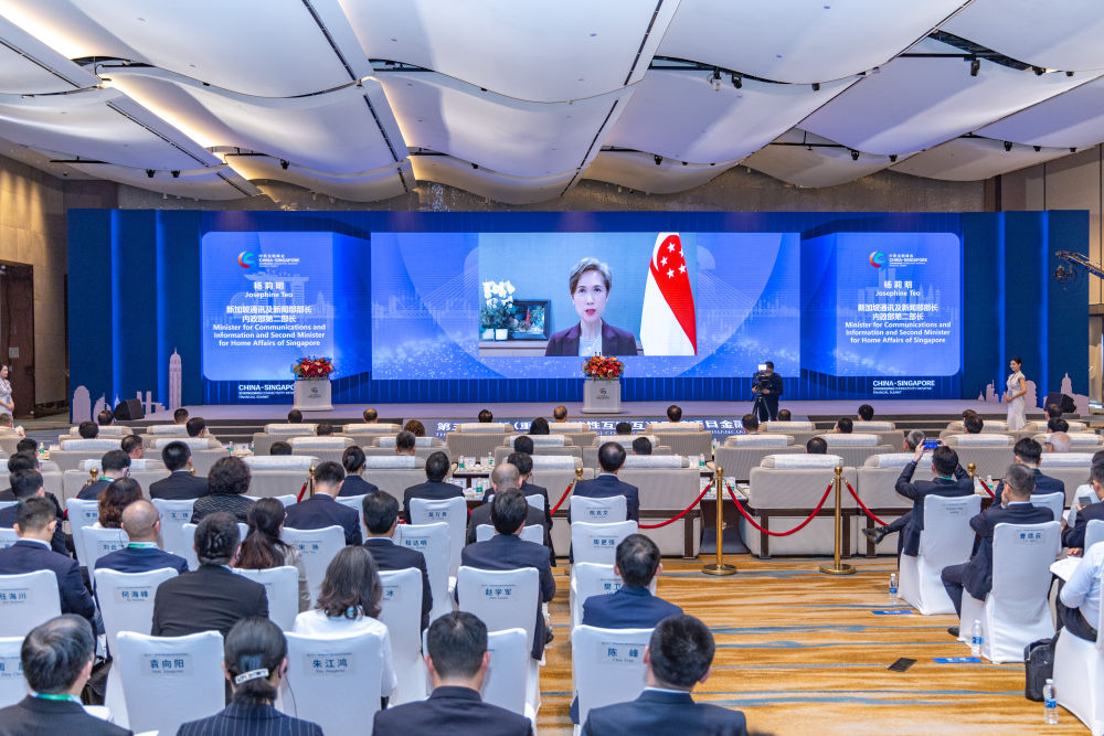 2023年4月20日,在重慶市第五屆中新(重慶)戰(zhàn)略性互聯(lián)互通示范項(xiàng)目金融峰會(huì)開(kāi)幕式現(xiàn)場(chǎng),新加坡通訊及新聞部部長(zhǎng)、內(nèi)政部第二部長(zhǎng)楊莉明線(xiàn)上致辭。新華社記者 黃偉 攝