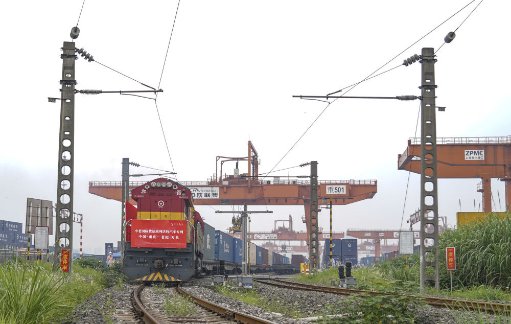 中老國(guó)際貨運(yùn)班列慶鈴汽車(chē)專(zhuān)列從重慶團(tuán)結(jié)村車(chē)站駛出(2022年6月8日攝)。新華社記者 黃偉 攝