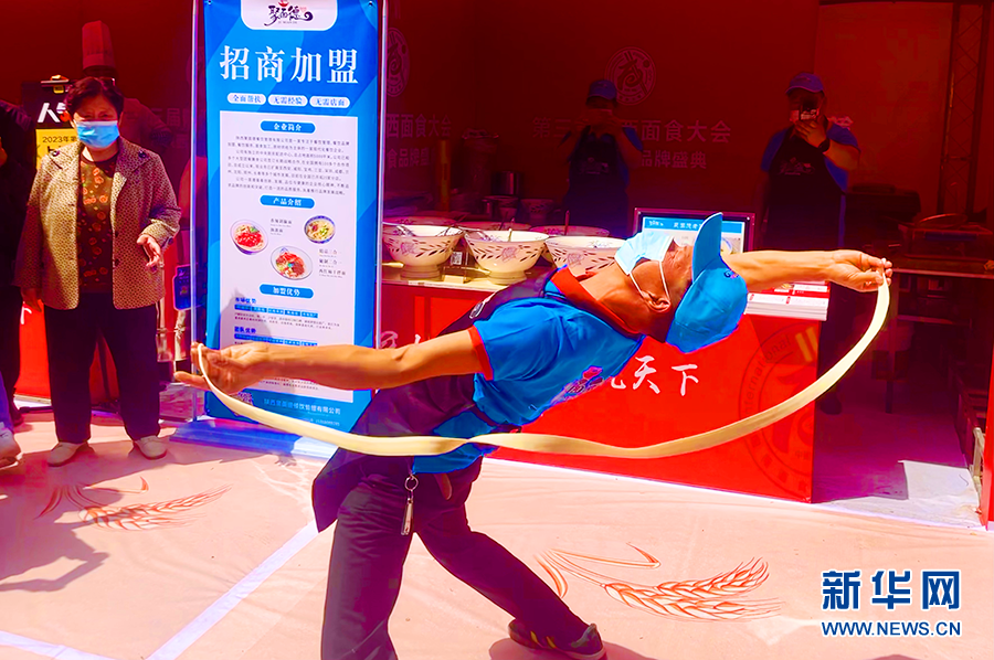 在第三屆陜西面食大會現(xiàn)場,一位面食師傅表演甩面。新華網(wǎng) 楊喜龍 攝