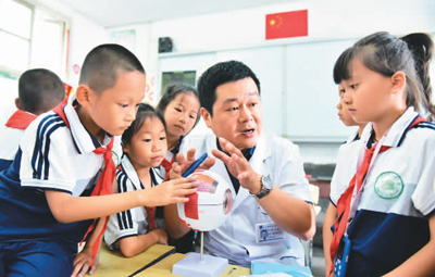 近日,在貴州省黔東南苗族侗族自治州從江縣城關(guān)第三小學(xué),眼科醫(yī)生給學(xué)生講解健康用眼知識(shí)。石宏輝攝(人民視覺)