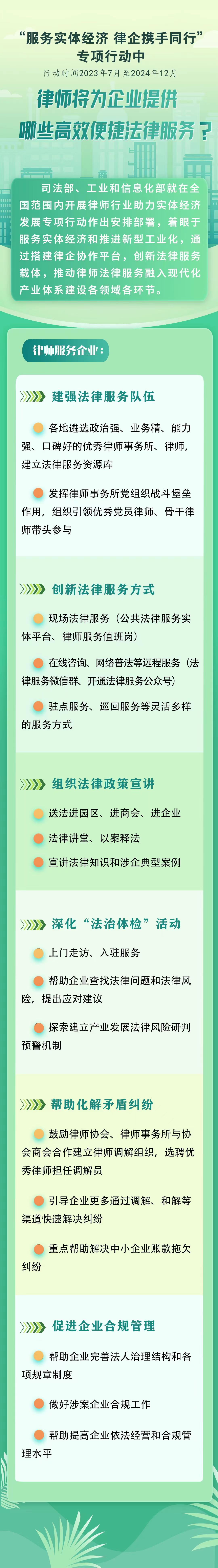 方案要求,各地司法行政部門、工業(yè)和信息化主管部門、通信管理局和律師協(xié)會要共同組織優(yōu)秀律師事務(wù)所和律師,為工業(yè)和信息化領(lǐng)域相關(guān)企業(yè)提供全業(yè)務(wù)、全時空、高效便捷的法律服務(wù)。活動中,要摸清各類企業(yè)法律服務(wù)需求,建強(qiáng)法律服務(wù)隊(duì)伍,創(chuàng)新法律服務(wù)方式,通過開展法律政策宣講、深化“法治體檢”活動等形式,推動律師行業(yè)服務(wù)實(shí)體經(jīng)濟(jì)的廣度和深度不斷拓展,服務(wù)的專業(yè)性、精準(zhǔn)性、便捷性、實(shí)效性不斷增強(qiáng),幫助企業(yè)化解法律風(fēng)險,解決法律問題,維護(hù)合法權(quán)益,提升依法合規(guī)經(jīng)營管理水平。