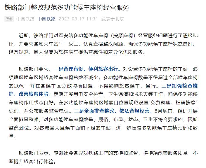 鐵路部門要求,一是合理布設(shè),便利旅客出行。對設(shè)置多功能候車座椅的車站,必須確保候車區(qū)域旅客候車座椅總數(shù)不減少,多功能候車座椅數(shù)量不得超過全部候車座椅的20%,并在各候車區(qū)分散均衡設(shè)置,不得影響旅客候車、通行。二是加強檢查維護(hù),改善旅客體驗。定期開展用電安全檢查、衛(wèi)生保潔和消殺滅等工作,確保多功能候車座椅作用狀態(tài)良好。在多功能候車座椅區(qū)域醒目位置規(guī)范設(shè)置“免費就座、掃碼按摩”標(biāo)識,并公布服務(wù)監(jiān)督電話。三是全面排查整改,依法合規(guī)經(jīng)營。8月底前,組織開展全面排查整頓,對多功能候車座椅數(shù)量、規(guī)格、布局、狀態(tài)、衛(wèi)生不符合要求的,限期整改到位。對客流量大且候車面積不足的車站,進(jìn)一步壓減多功能候車座椅比例和數(shù)量。