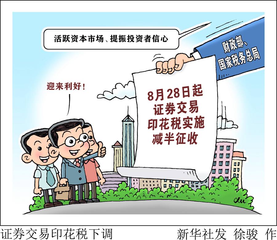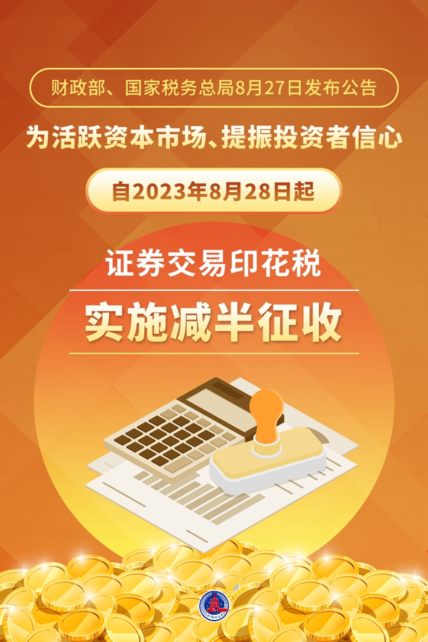 新華社北京8月27日電 記者27日從財政部了解到,財政部、國家稅務(wù)總局當日發(fā)布公告稱,為活躍資本市場、提振投資者信心,自2023年8月28日起,證券交易印花稅實施減半征收。