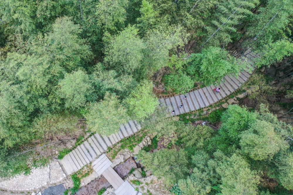 圖為游客在藍(lán)山縣藍(lán)山谷景區(qū)竹林內(nèi)游玩。(彭華 攝)