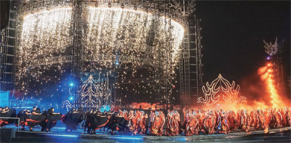 四川省涼山彝族自治州西昌市火把廣場(chǎng)舉辦的第八屆涼山彝族火把節(jié)開(kāi)幕式活動(dòng)現(xiàn)場(chǎng),演員們載歌載舞,為游客獻(xiàn)上精彩演出。