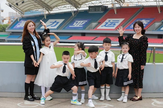 浙江省杭州市丁信幼兒園教師徐元鳳(右一)與孩子們一起迎亞運(yùn)。受訪者供圖