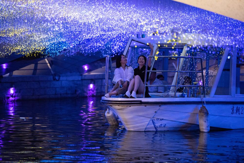 這是人們乘坐北京亮馬河游船經(jīng)過被裝點成“星空”的好運橋。 新華社記者 陳鐘昊 攝