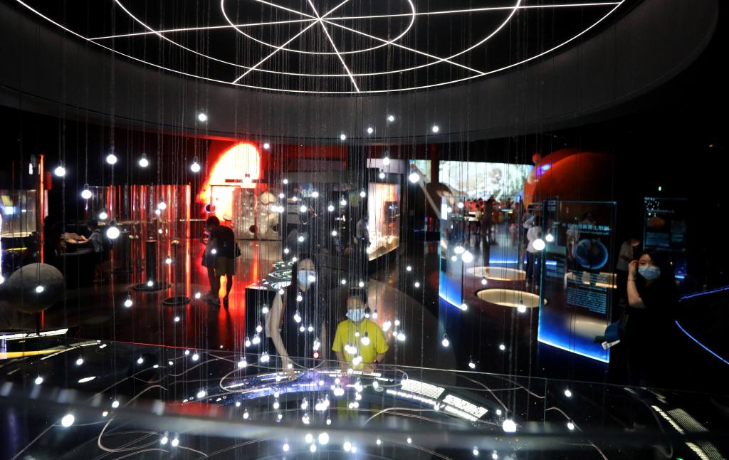 參觀者在上海天文館“家園”展區(qū)內一個名為“太陽的鄰居”的裝置展品前駐足觀看。新華社記者 方喆 攝