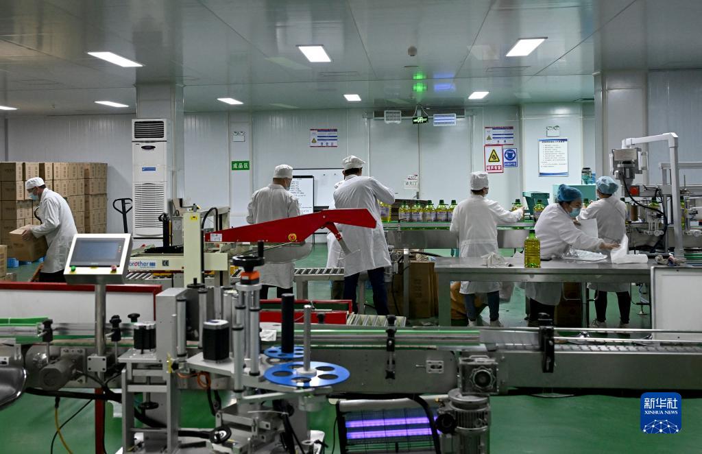 11月4日,在阿拉山口綜合保稅區(qū)內的阿拉山口金牧生物科技有限公司,工作人員在包裝亞麻籽油。新華社記者 趙晨捷 攝