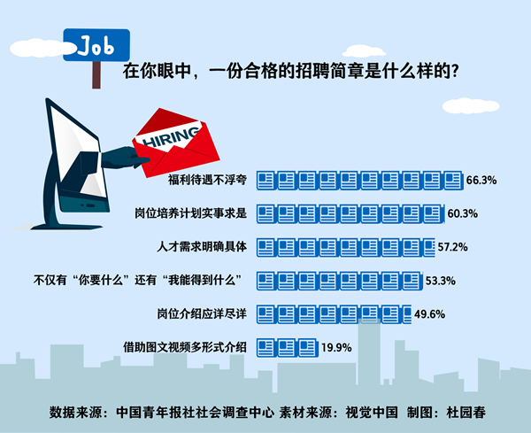 日前,中國(guó)青年報(bào)社社會(huì)調(diào)查中心聯(lián)合問(wèn)卷網(wǎng)(wenjuan.com),對(duì)1334名應(yīng)屆大學(xué)生進(jìn)行的一項(xiàng)調(diào)查顯示,在他們眼中,一份合格的招聘簡(jiǎn)章,首先是福利待遇不浮夸(66.3%),其次是崗位培養(yǎng)計(jì)劃實(shí)事求是(60.3%),再次是人才需求明確具體(57.2%)。