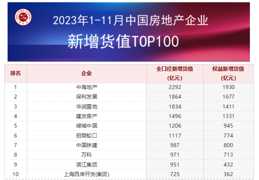根據(jù)中指研究院數(shù)據(jù)顯示,中海地產(chǎn)、保利發(fā)展、華潤(rùn)置地占據(jù)新增貨值榜單前三位。2023年1-11月,中海地產(chǎn)以累計(jì)新增貨值2292億元占據(jù)榜單第一;保利發(fā)展、華潤(rùn)置地緊隨其后,累計(jì)新增貨值規(guī)模分別為1864億元和1834億元。TOP10企業(yè)2023年1-11月新增貨值總額13442億元,占TOP100企業(yè)的41.7%;TOP100企業(yè)新增貨值門(mén)檻為121億元。