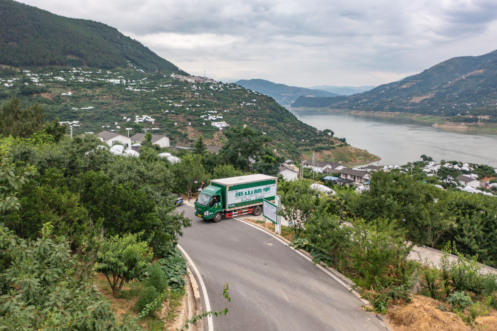 ↑重慶市巫山縣曲尺鄉(xiāng)柑園村,裝載有巫山脆李的中國郵政物流車行駛在村內(nèi)(無人機(jī)照片,6月28日攝)。過去因?yàn)槲锪鞑槐?,?jīng)過幾天的運(yùn)輸后,脆李的品質(zhì)和口感會受到影響。現(xiàn)在,航空快遞的開通,讓巫山脆李快速走向全國。