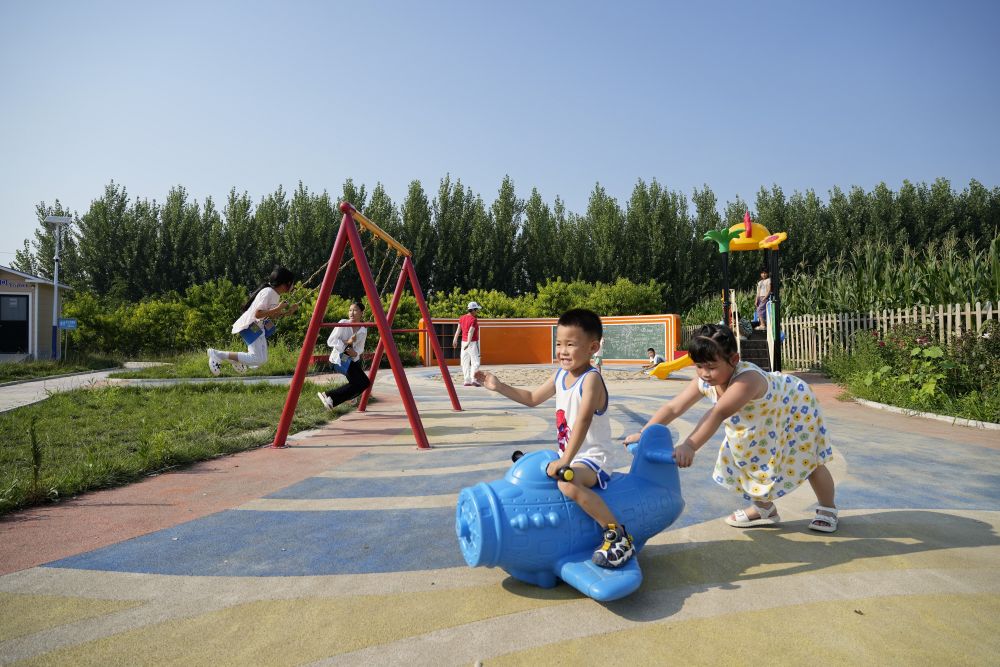 ↑孩子們在河北省唐山市豐南區(qū)趙新莊村一處游園內(nèi)玩耍(7月19日攝)。豐南區(qū)因地制宜實(shí)施美麗鄉(xiāng)村提升工程,通過改造農(nóng)村閑置破舊房屋、清理溝渠坑塘等措施,300余個(gè)行政村建起鄉(xiāng)村游園。