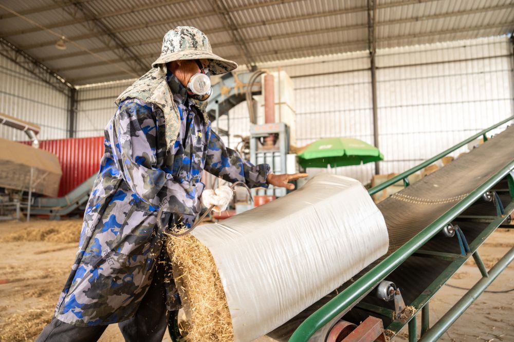↑湖南省益陽市南縣武圣宮鎮(zhèn)沿河堤村,工人把打捆好的秸稈放置在傳送帶上(11月25日攝)。
