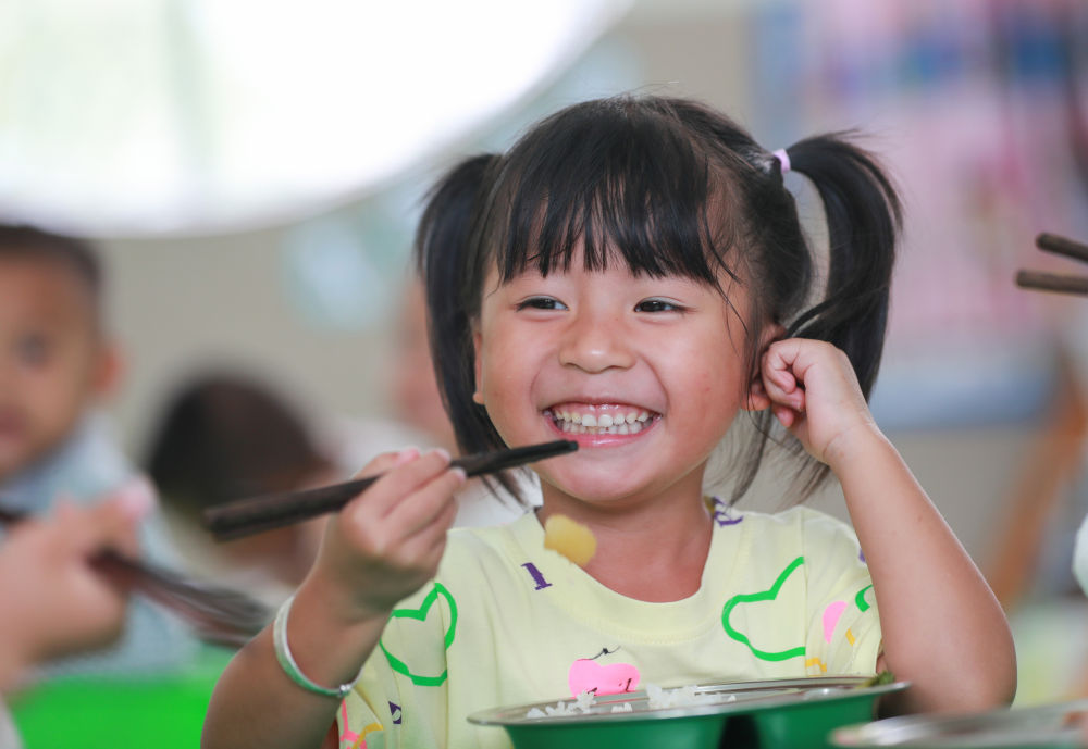 ↑貴州省從江縣剛邊壯族鄉(xiāng)中心幼兒園的小朋友在享用免費(fèi)營養(yǎng)午餐(9月15日攝)。