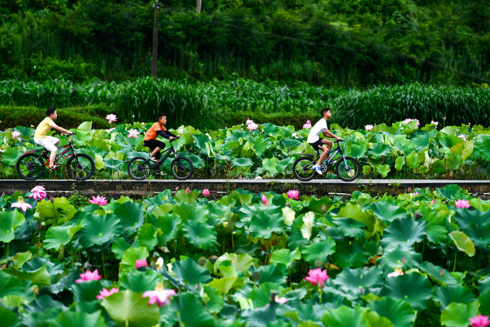 ↑孩子們在貴州省岑鞏縣客樓鎮(zhèn)下寨村騎行游玩(8月2日攝)。