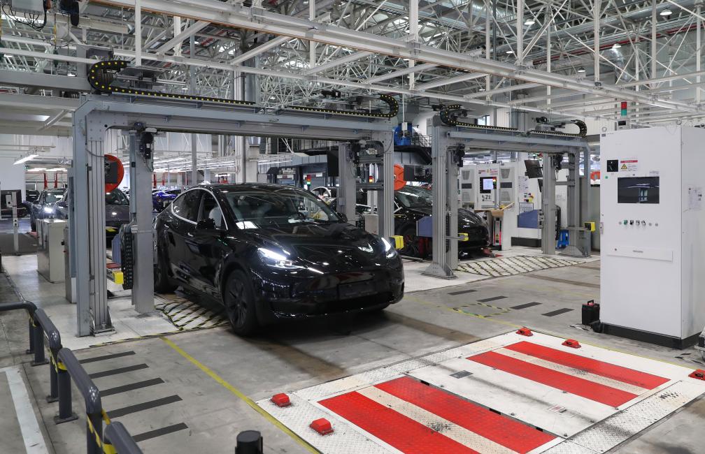 12月22日,在特斯拉上海超級(jí)工廠內(nèi),一輛特斯拉電動(dòng)汽車(chē)在進(jìn)行出廠前的車(chē)載電子設(shè)備檢測(cè)。新華社記者方喆 攝