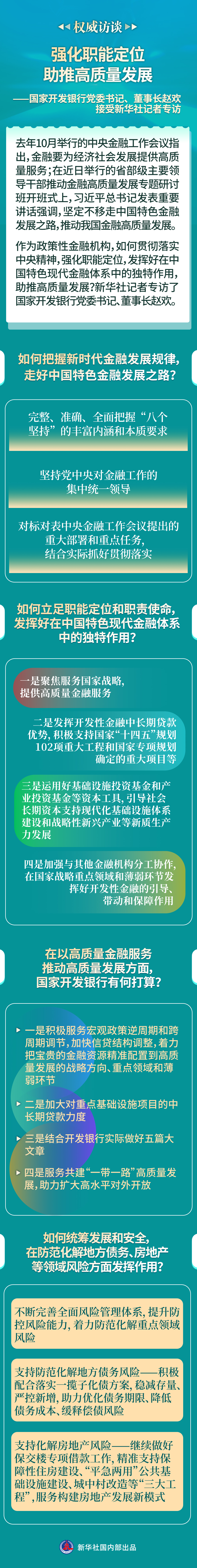 作為政策性金融機(jī)構(gòu),如何貫徹落實(shí)中央精神,強(qiáng)化職能定位,發(fā)揮好在中國(guó)特色現(xiàn)代金融體系中的獨(dú)特作用,助推高質(zhì)量發(fā)展?新華社記者專訪了國(guó)家開發(fā)銀行黨委書記、董事長(zhǎng)趙歡。