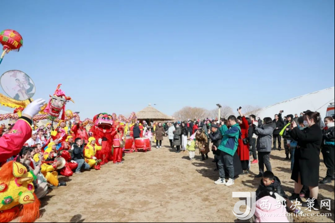 雪后的沙山與熱鬧非凡的社火表演,交織出一幅令人心花怒放的秀麗畫卷,游人近距離觀看社火表演,鉆龍、合影,祈福納祥,眾人歡聲笑語不斷,在社火中感受中國傳統(tǒng)節(jié)日獨(dú)有的民俗魅力,盡享年味敦煌。