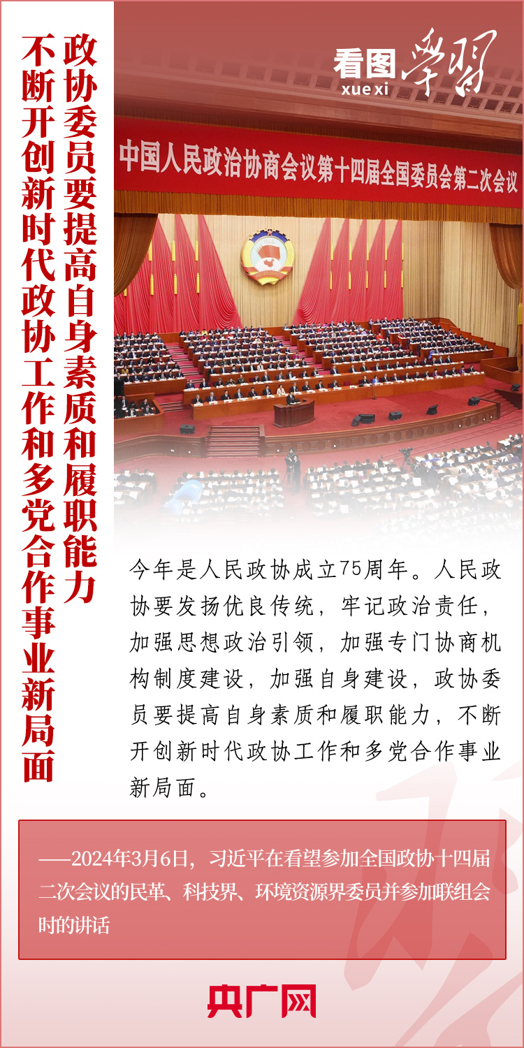 今年是人民政協(xié)成立75周年。3月6日下午,習(xí)近平總書記在看望參加全國(guó)政協(xié)十四屆二次會(huì)議的民革、科技界、環(huán)境資源界委員并參加聯(lián)組會(huì)時(shí)強(qiáng)調(diào),人民政協(xié)各黨派、各團(tuán)體、各族各界各方面人士要圍繞中共二十大提出的重大戰(zhàn)略任務(wù)和中央經(jīng)濟(jì)工作會(huì)議部署,深入調(diào)查研究,積極建言資政,廣泛凝聚共識(shí),助力中國(guó)式現(xiàn)代化建設(shè)。一起來(lái)學(xué)習(xí)!